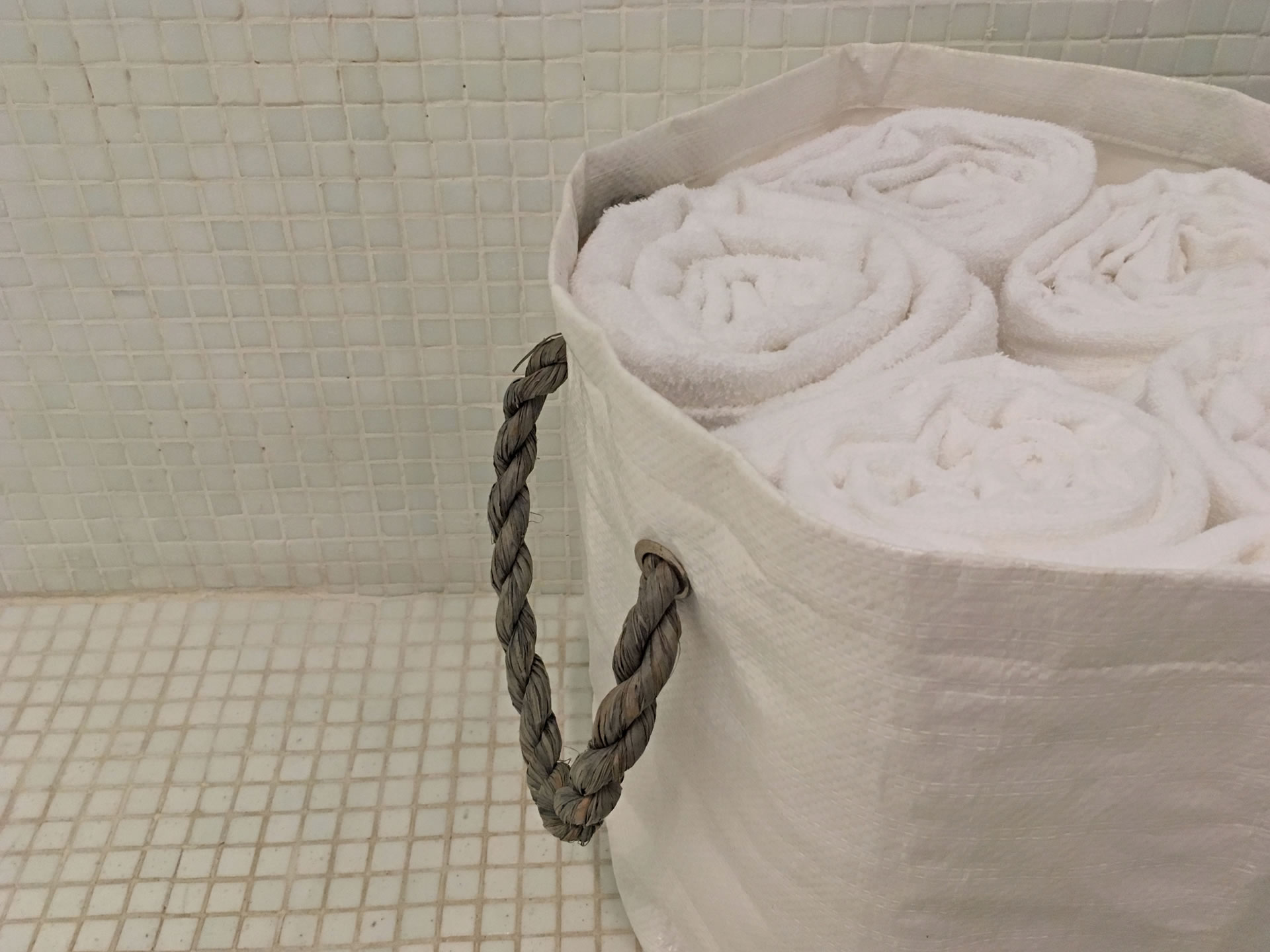 Our PVC baskets are the perfect addition to your home: use them to display your pool towels and store you bathing costumes, kiddies toys or as a hold-all beach bag. White basket with plaited handles.